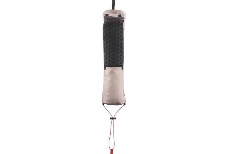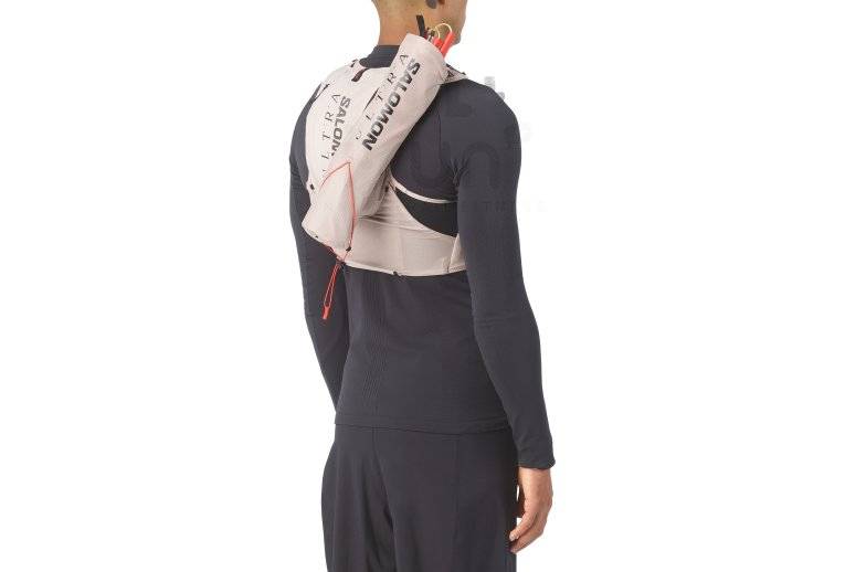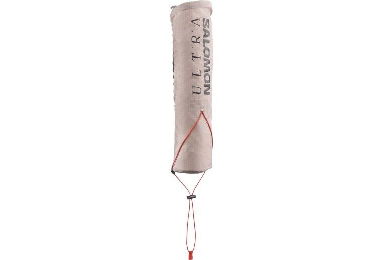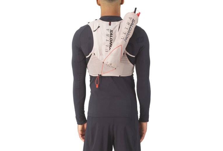 Son système de fixation sur le haut permet d'attacher aisément le modèle au gilet d'hydratation Salomon S-Lab Ultra 10.