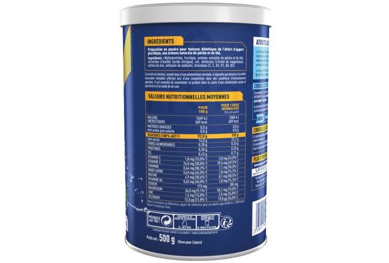 Maltodextrine, fructose, arômes naturels de pêche et de thé, correcteur d'acidité (acide citrique), sel, minéraux (citrate de magnésium, sulfate de zinc, sélénate de sodium),vitamines (C,E,B3,B1,B6,B2).