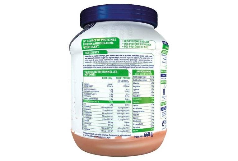 Préparation en poudre diététique, pour boisson enrichie en protide, aromatisée saveur cookie cream, avec édulcorants. Aliment adapté aux régimes vegan. Protéines végétales : soja (81.8%), quinoa (4.5%), pois (4%) : poudre de cacao maigre, arôme naturel, arôme, maltodextrine, épaississant : gomme de xanthane ; sel, vitamines (C, E, B12, B6, B9), édulcorants : sucralose, acésulfame-K ; minéraux : sulfate de zinc, sélénate de sodium.