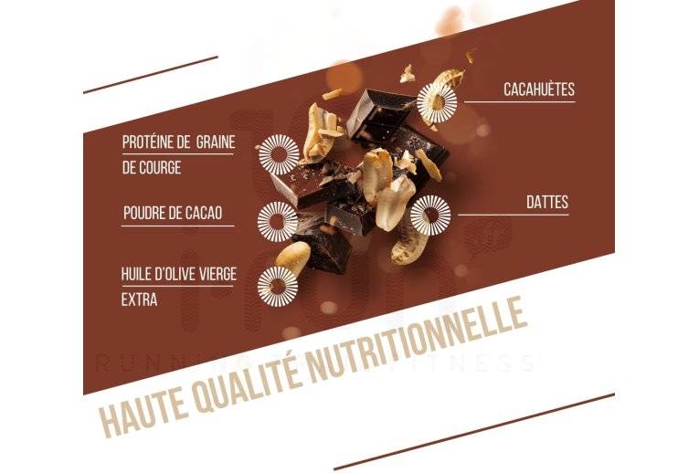 Protéines de graines de courges toastées*, pâte de dattes*, pâte de pomme* (jus concentré de pomme*, purée concentrée de pomme*), cacahuète 18%, huile d'olive vierge extra*, poudre de cacao* 2%, arôme naturel de chocolat 0.5%.?
