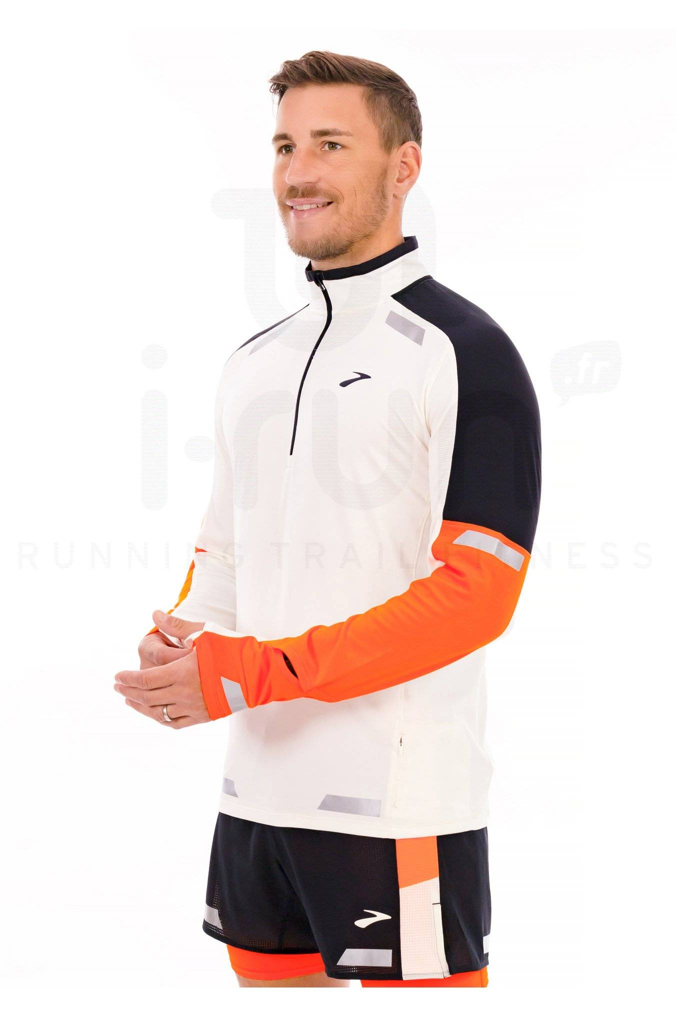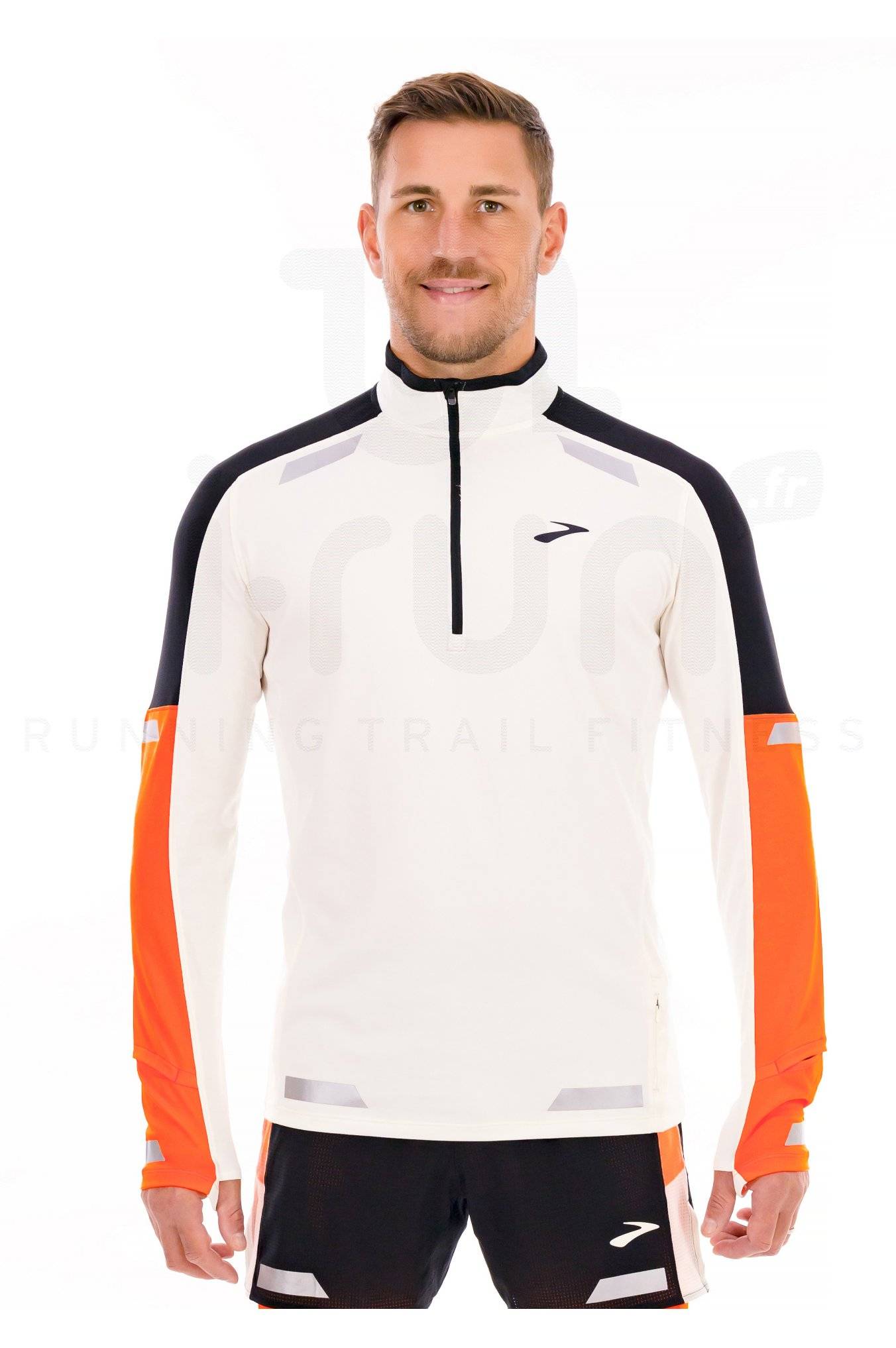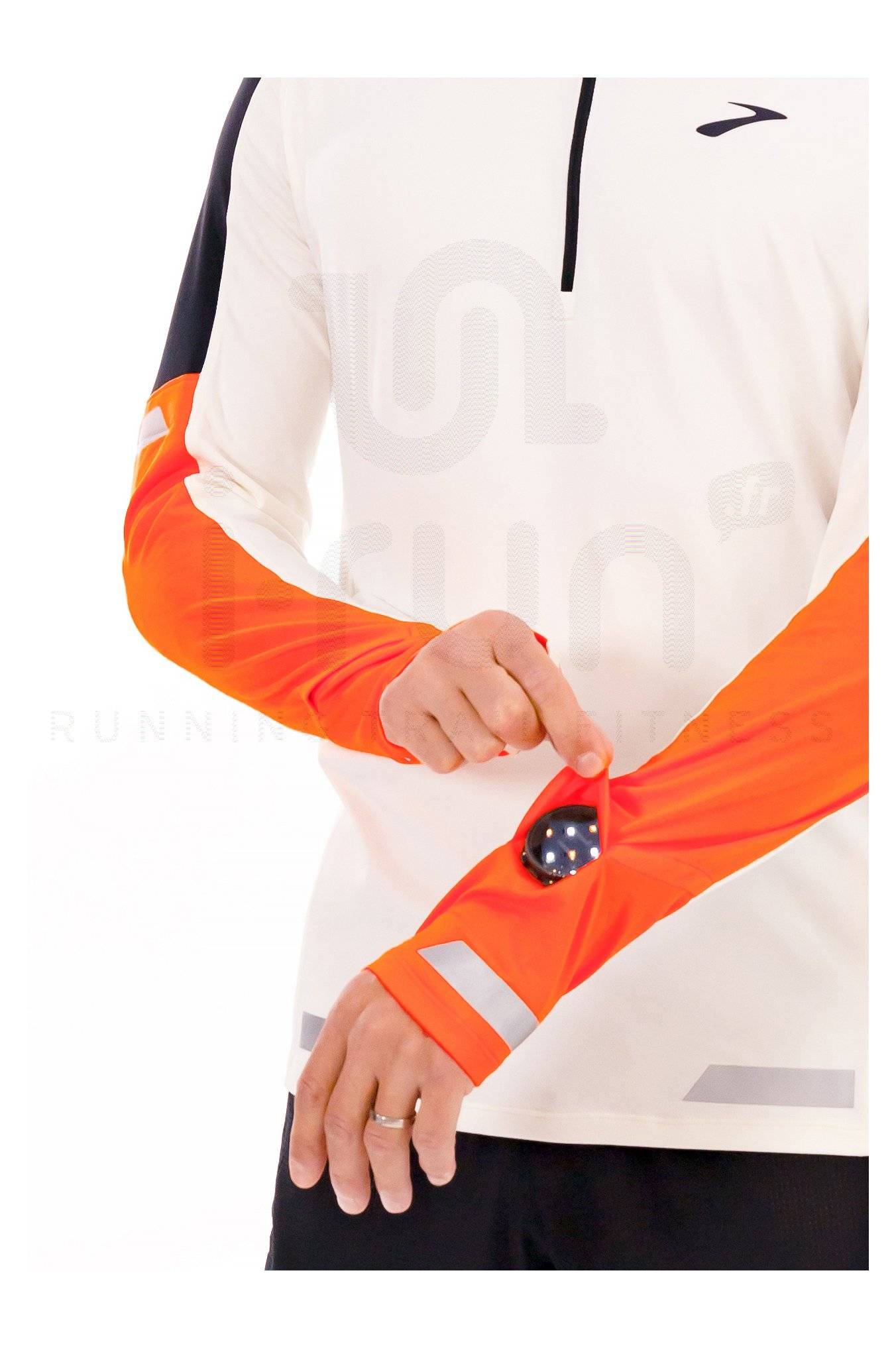 Le demi-zip vous donne la possibilité de moduler la quantité d'aération perçue pendant l'effort et des ouvertures sont spécialement prévues pour voir votre montre facilement.